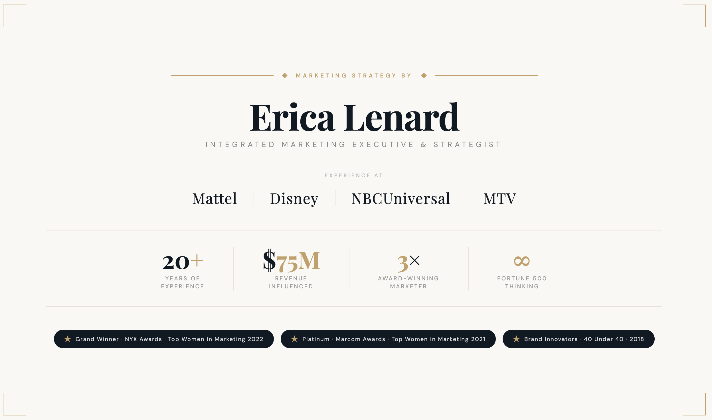 I'm Erica Lenard — a marketing executive with 20+ years leading brand and marketing strategy at Mattel, The Walt Disney Company, and NBCUniversal. I now bring that same Fortune 500 thinking to businesses of every size, at prices that actually make sense."